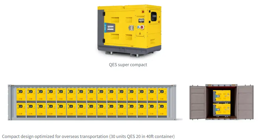 The innovative super compact QES model is designed to grant the most efficient transportation. You can fit up to 30 units of Atlas Copco QES 20 in a 40 feet container, the most for a 20kVA power Atlas Generator in the market! It means optimized transport, reduced CO2 emissions and operational costs, which results in a lower Total Cost of Ownership (TCO). Its environmentally friendly design makes it ideal for storage overseas, reducing exponentially your footprint on-site.