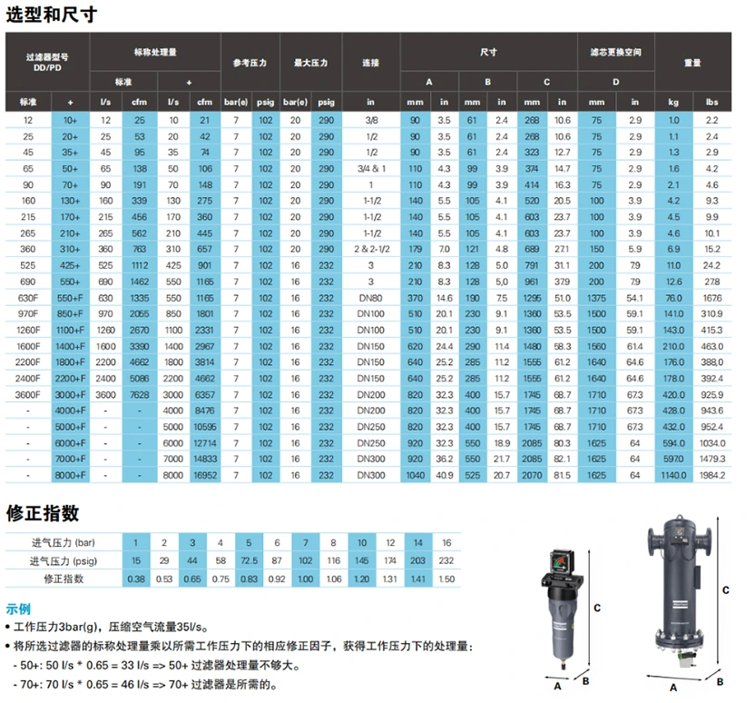 This table provides information about compressed air filters and some special applications. |