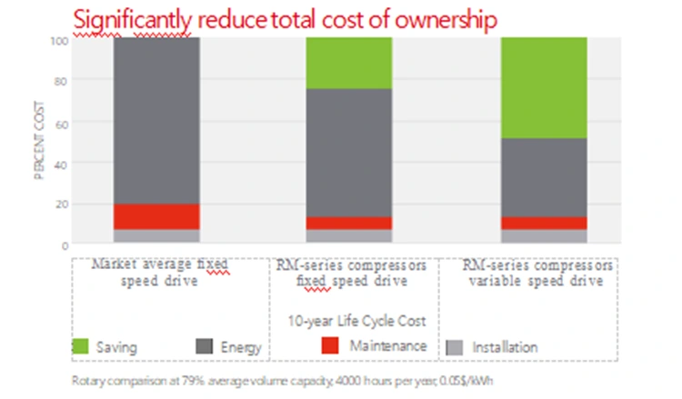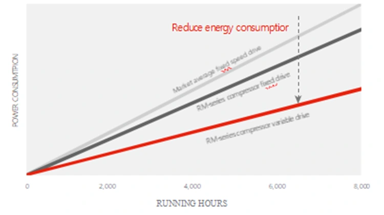 each RM series air compressor is equipped with a brand-new, high-efficiency main unit, combining an IE3 fixed-speed motor and ECO*-PM VSD IE5 variable-frequency motor technology, helping you save up to 12-30% on energy costs.